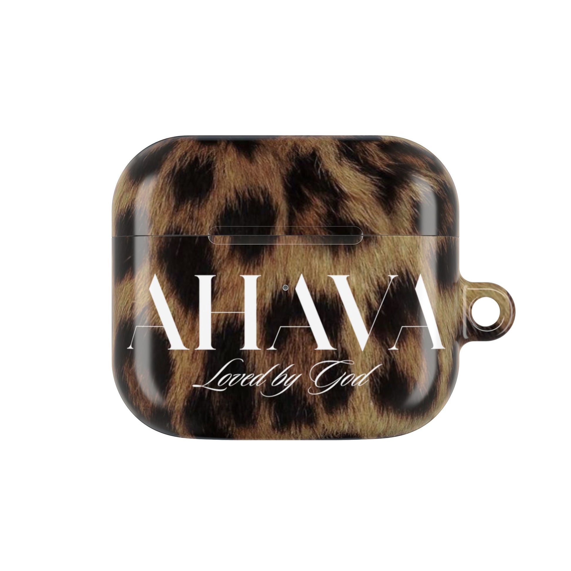 Crafted for all AirPods sizes, this case features a striking leopard print background, the word Ahava in a sleek luxury font, and Loved by God in a graceful script beneath it.