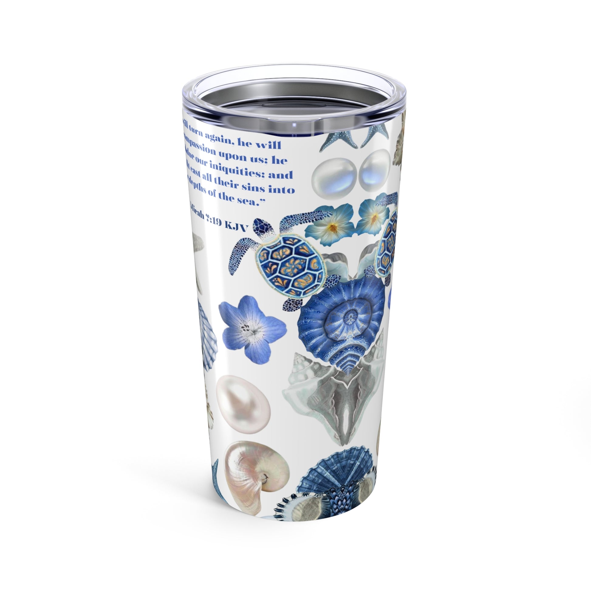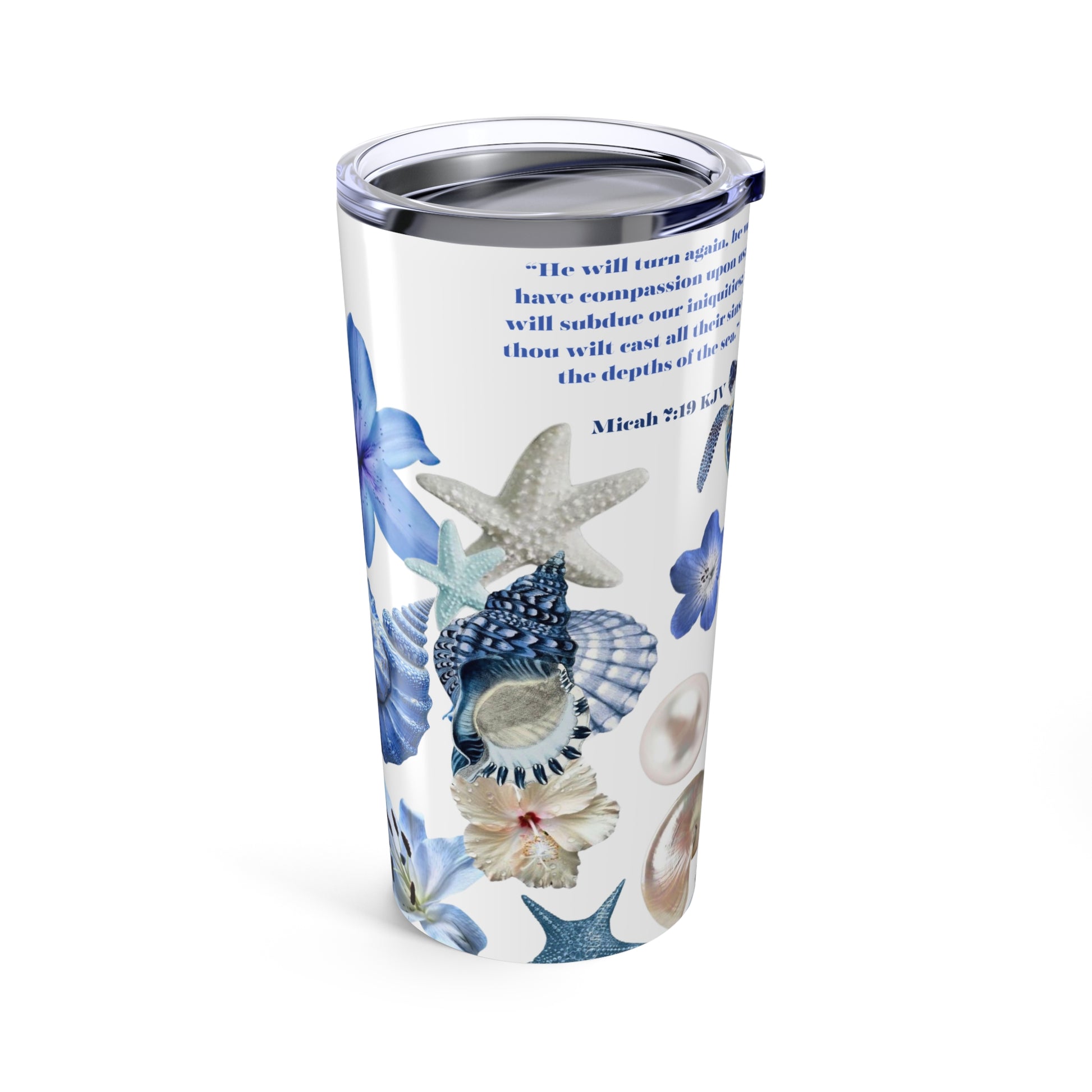 Dive into daily refreshment with our Blue Oceans 20oz Stainless Steel Tumbler, inspired by Micah 7:19 — “You will cast all our sins into the depths of the sea.” Decorated with ocean-inspired stickers, seashells, and soothing blue tones, this tumbler is more than just a drinkware piece — it’s a reminder of God’s mercy and endless grace.