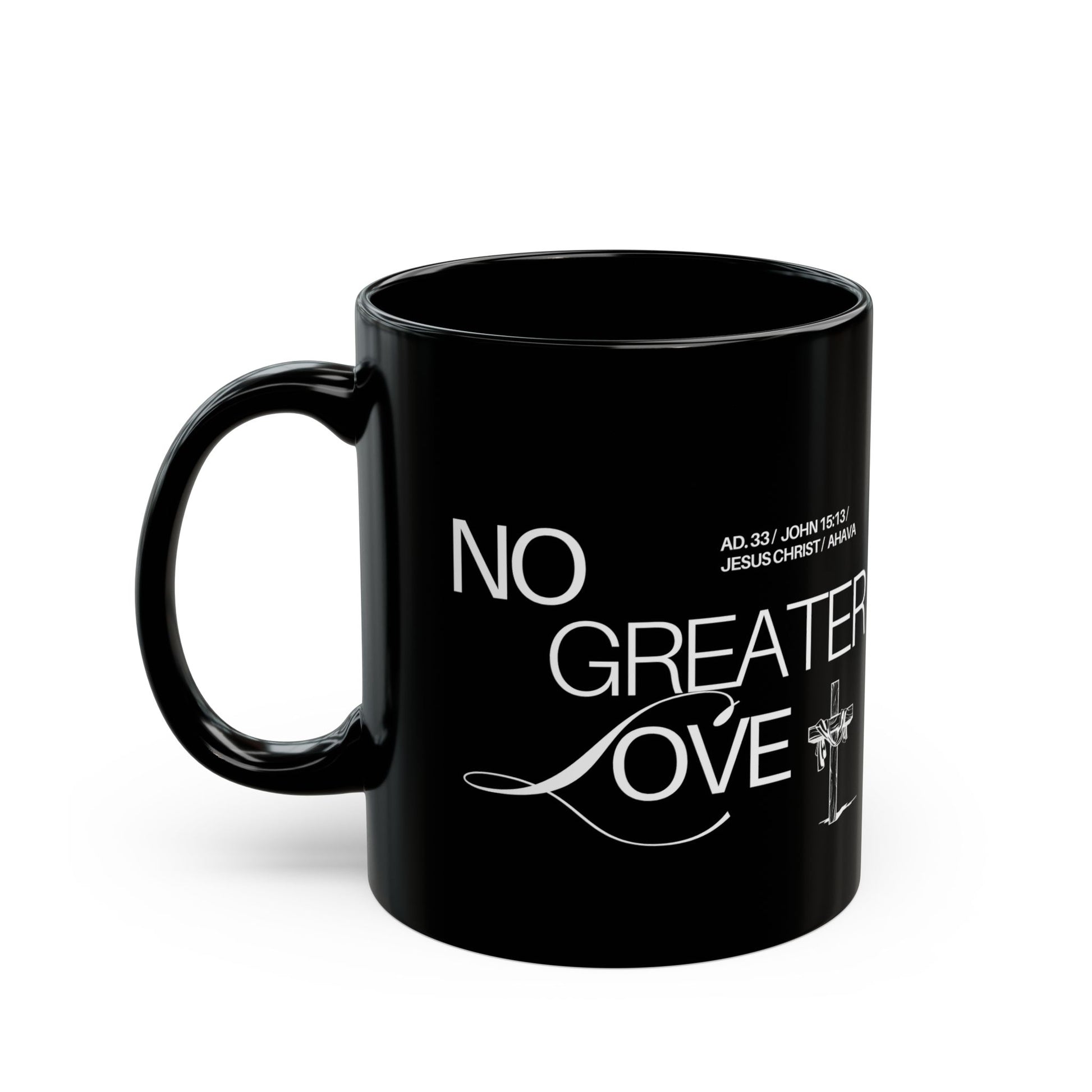 Start your day with a bold reminder: No Greater Love. This glossy black ceramic mug features a clean white font for a striking contrast. Holds 11oz of your favorite coffee, tea, or cocoa — ideal for daily devotionals or quiet mornings with Jesus.